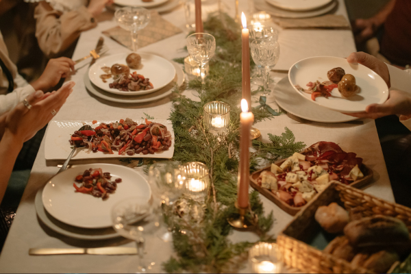 Travessas, saladeiras e acompanhamentos devem ficar em pontos estratégicos para fácil acesso. Isso garante que a mesa funcione de forma prática e continue bonita.